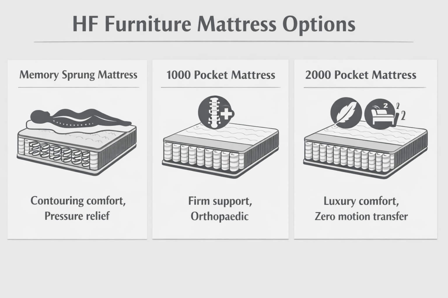 •2000 Pocket Sprung Mattress: The pinnacle of luxury, providing independent spring movement for zero motion transfer and tailored comfort.