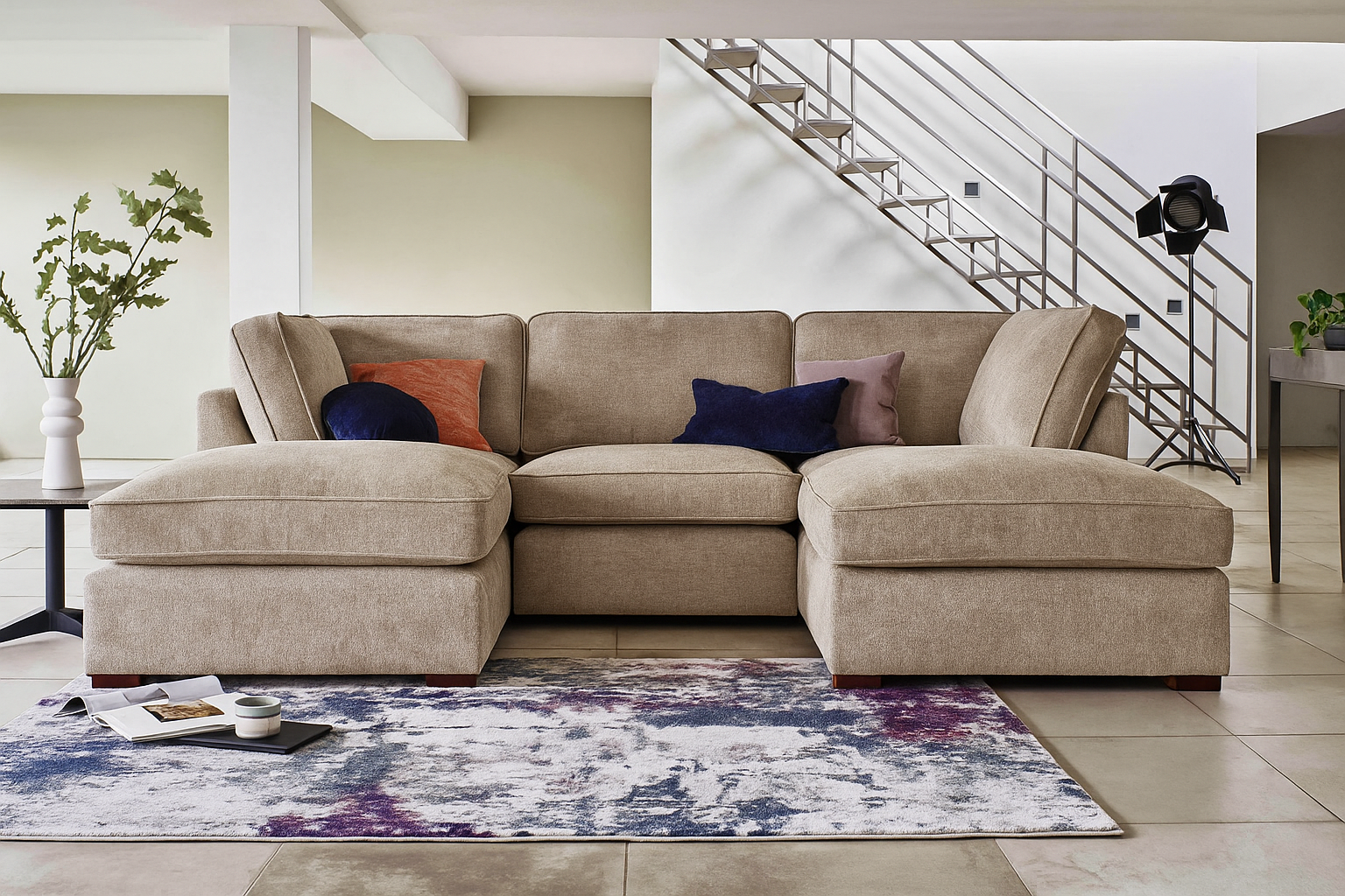 There’s room for everyone to lounge in comfort on this U-shaped corner sofa in cream. Cleverly designed for flexible seating, it has ultra-soft chenille upholstery and reversible cushions.