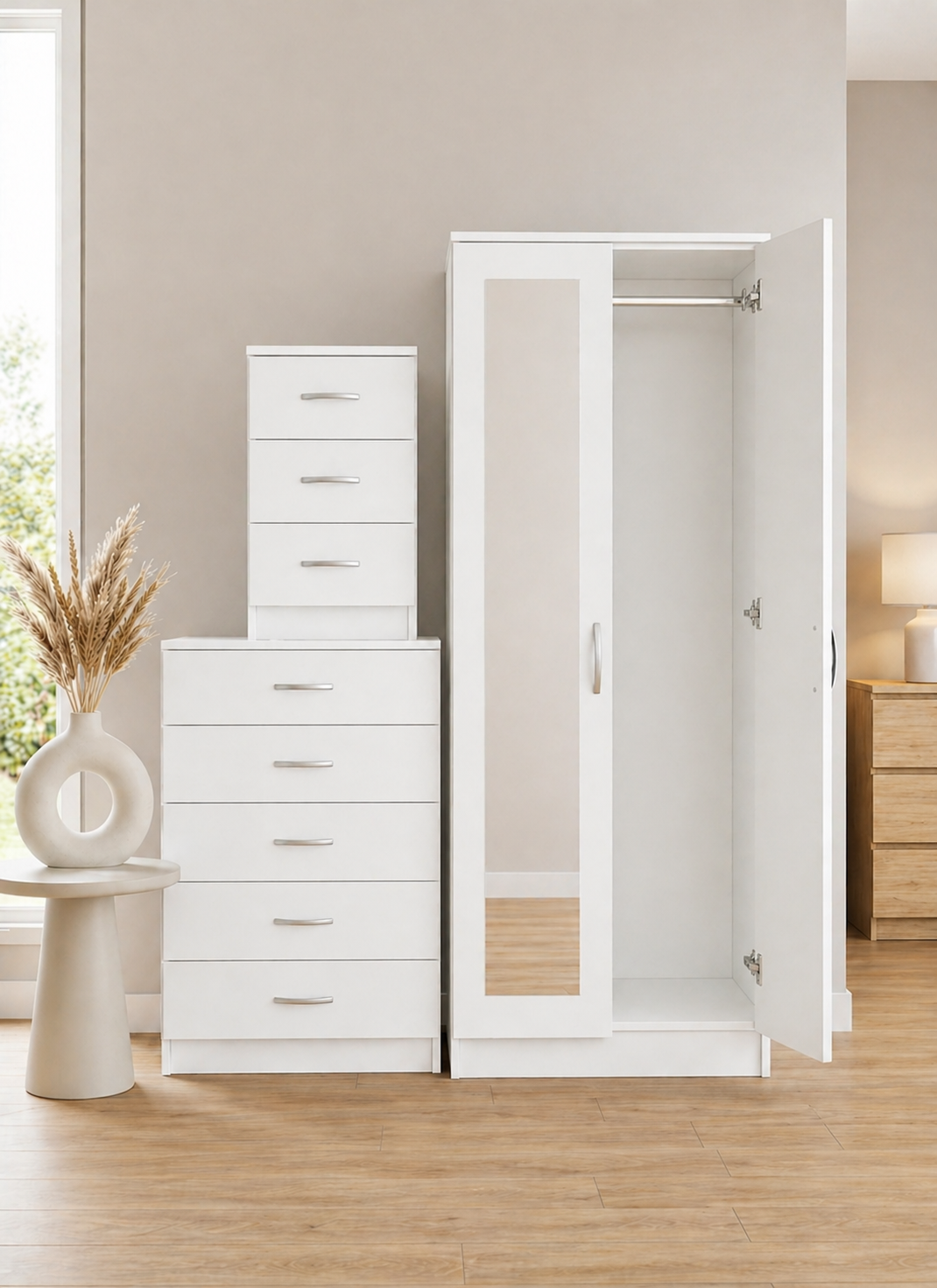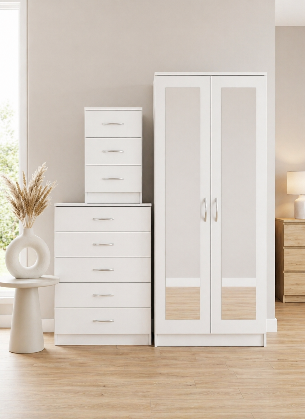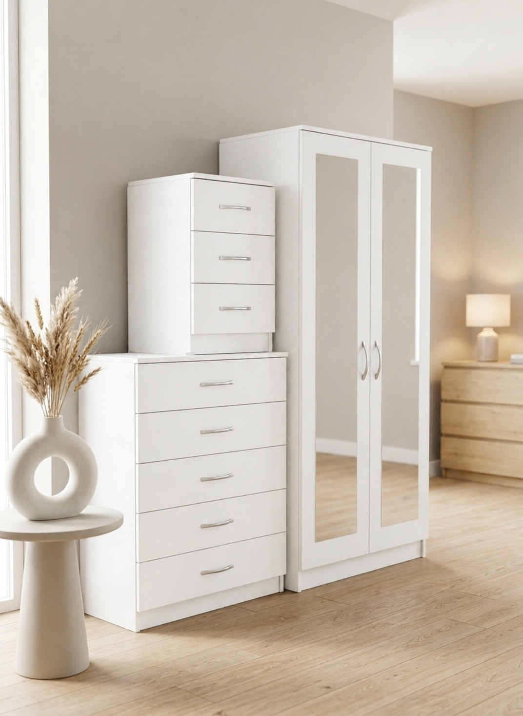 The set includes three key pieces. First, you get a 2-door mirrored wardrobe with full-length panels. Second, there’s a 5-drawer chest of drawers. Finally, a matching bedside table completes the look. All three are finished in a sleek White gloss.